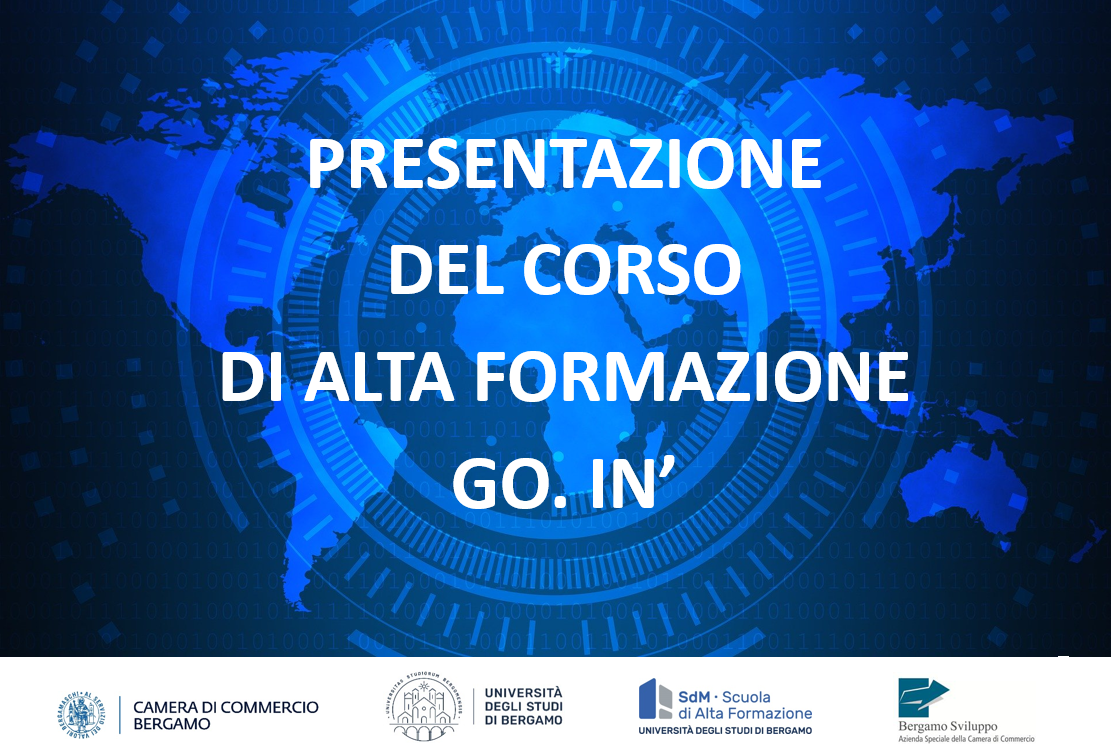 • Il corso GO. IN' fornisce ai partecipanti strumenti e metodologie efficaci per affrontare un contesto sempre più dinamico e internazionalizzato, in modo da poter assumere decisioni strategiche e organizzative efficaci, anche in un periodo di cambiamento continuo come quello attuale. L'edizione 2025 del corso, dal titolo “GO. IN’ 2025 – SCENARI GLOBALI E OPPORTUNITÀ DI CRESCITA PER LE MPMI"  prevede 60 ore di formazione e 110 ore complessive di coaching individuale da suddividere tra le imprese partecipanti (max 20 ore a impresa). Il corso si svolgerà da maggio a settembre 2025 e al termine delle ore di formazione verranno attribuite le ore di coaching. E' prevista una quota di partecipazione da versare a titolo di co-finanziamento privato, riservata alle imprese della provincia di Bergamo.